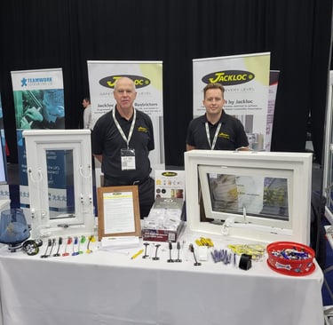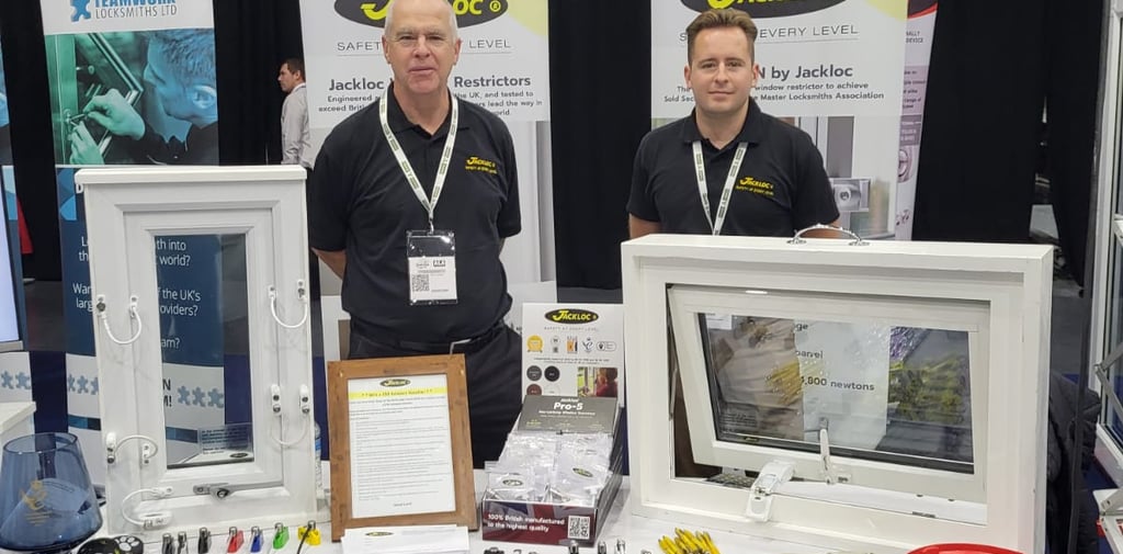 Many customers ask how do locksmiths keep themselves updated ? Well we cant speak for everyone but for ourselves we network with other locksmiths using whatsapp groups and locksmith forums, we also subscribe to locksmith journals, follow youtube and of course attend locksmith exhibitions. The most recent locksmith exhibition was held in October 2023 at the International Centre, Telford, Shropshire. Its the largest in Europe and provided both myself and Pam with the opportunity to meet lock manufacturers, lock distributors and locksmith tool inventors. The photo above is of the Jackloc team who manufacture probably the best and strongest window restrictors in the UK for both residential and commercial customers. These window restrictors are designed to help prevent falls from windows but also provide extra security for windows.